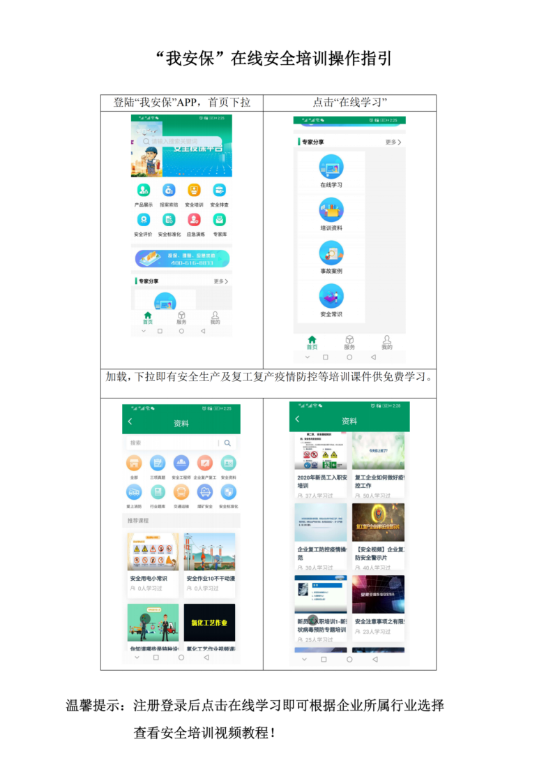 全國范圍新冠疫情已得到有效控制,各地都在緊張的組織企業(yè)復(fù)工復(fù)產(chǎn),安全生產(chǎn)是企業(yè)復(fù)工復(fù)產(chǎn)的重要保證。現(xiàn)階段,“我安保”APP線上培訓所有資源均免費向企業(yè)開放,主要是針對各行業(yè)領(lǐng)域的企業(yè)從業(yè)人員進行安全生產(chǎn)教育線上培訓,江泰公司上傳培訓視頻資源,還與專業(yè)的安全培訓機構(gòu)合作,安全教育培訓資源豐富,涉及的行業(yè)領(lǐng)域齊全,非常適合疫情當下企業(yè)復(fù)工復(fù)產(chǎn)開展線上安全生產(chǎn)培訓。